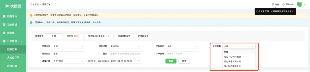 为更方便团长管理" 未发货订单 ", 快 团团上线了订单发货时效筛选能力, 团长可在【团购订单】-【快速筛选】中查看以下数据。