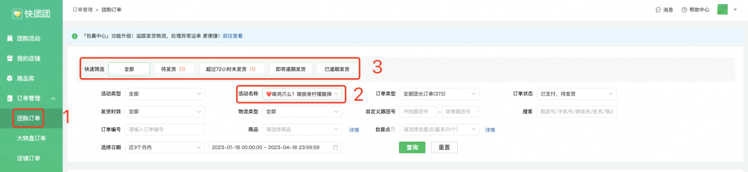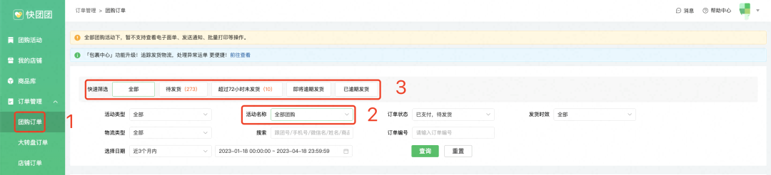团长可在【团购订单】------【快速筛选】中,切换查看单个团购/全部团购的超72小时未发货&即将逾期发货&已逾期发货的快递订单。