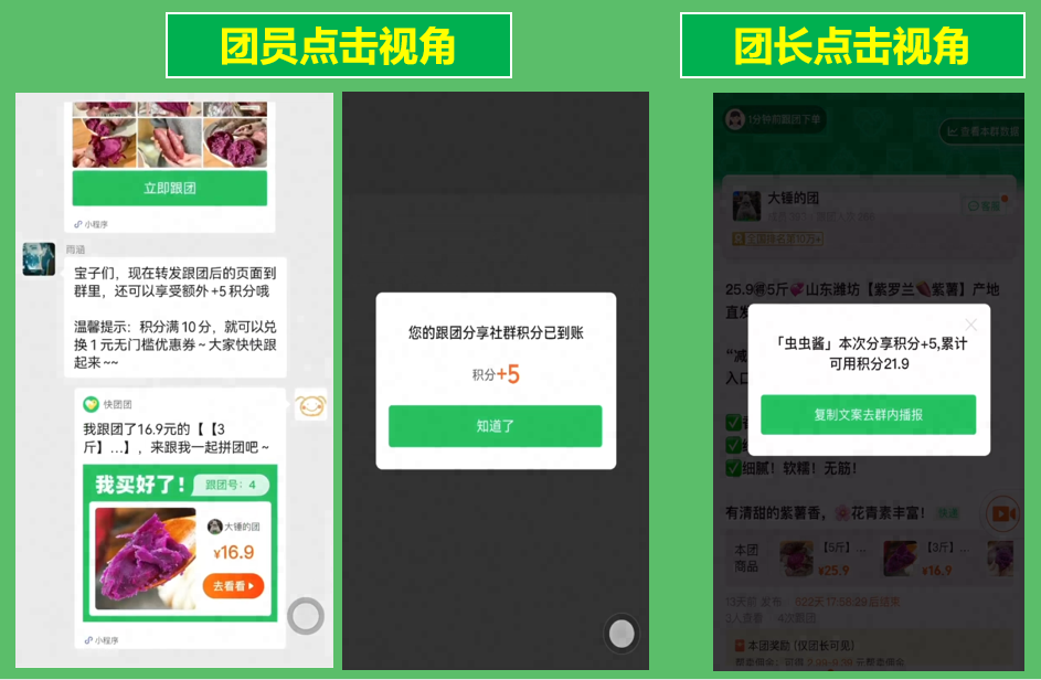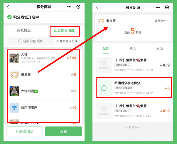 1、 分享到社群的卡片需再次点击 ,才会加积分,团长或团员都可点击(分享至私聊无效);