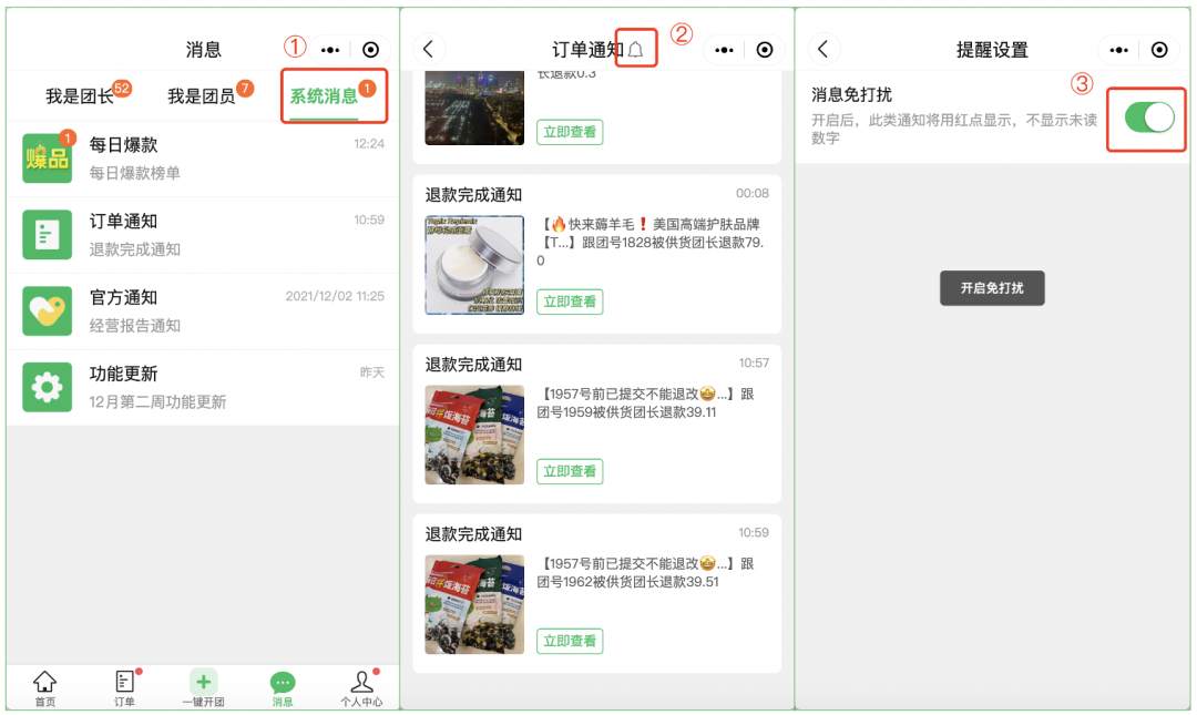 团长进入系统消息,点击铃铛,就可以设置免打扰~