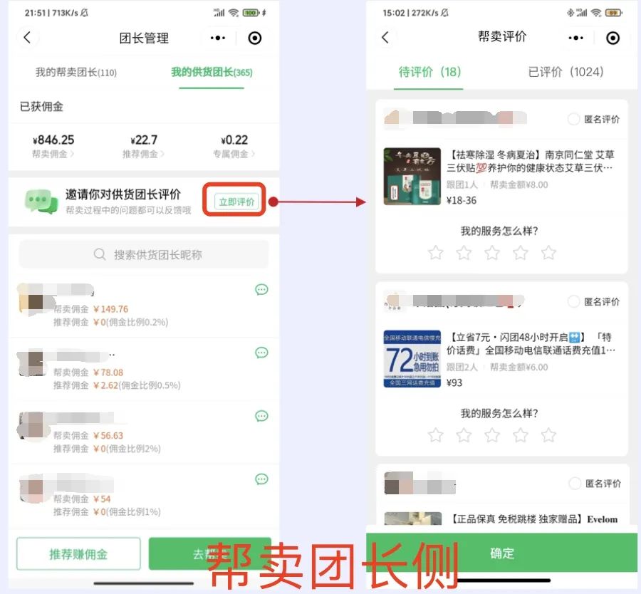 在【团长管理】模块新增了一个集中的评价入口,能够让供货团长方便查看评价,让帮卖团长方便查看评价和去评价。