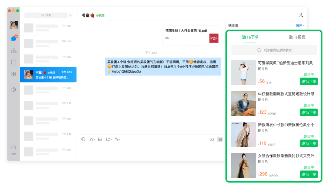 【我的团购】 :直接向客户发送团购主 动建 联,邀请下单/帮卖