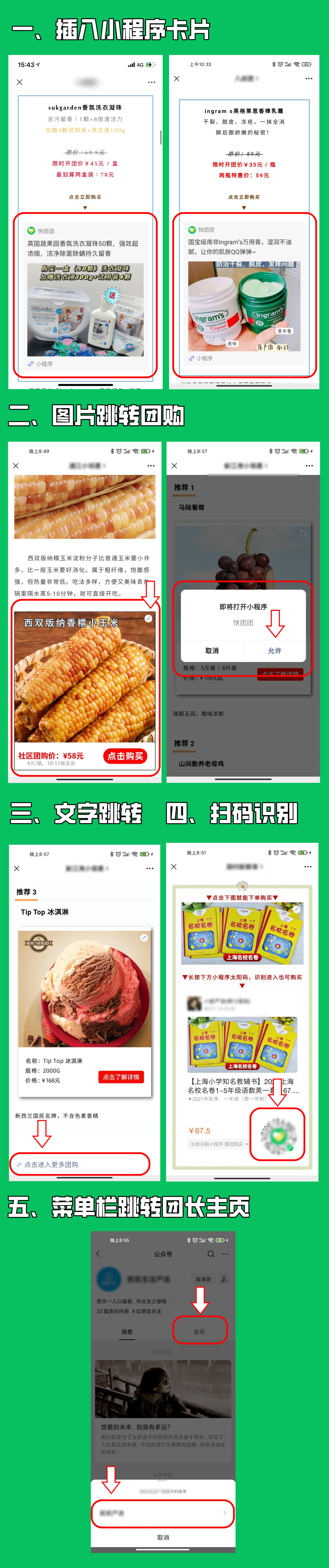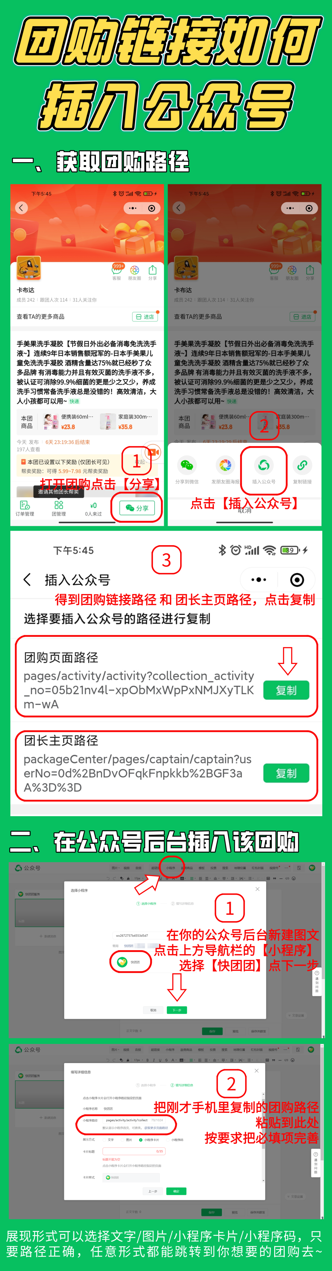 公众号插入团购的花式玩法可太多了!插入小程序卡片/图片跳转/文字跳转/扫码识别/菜单栏跳转团长主页等等~