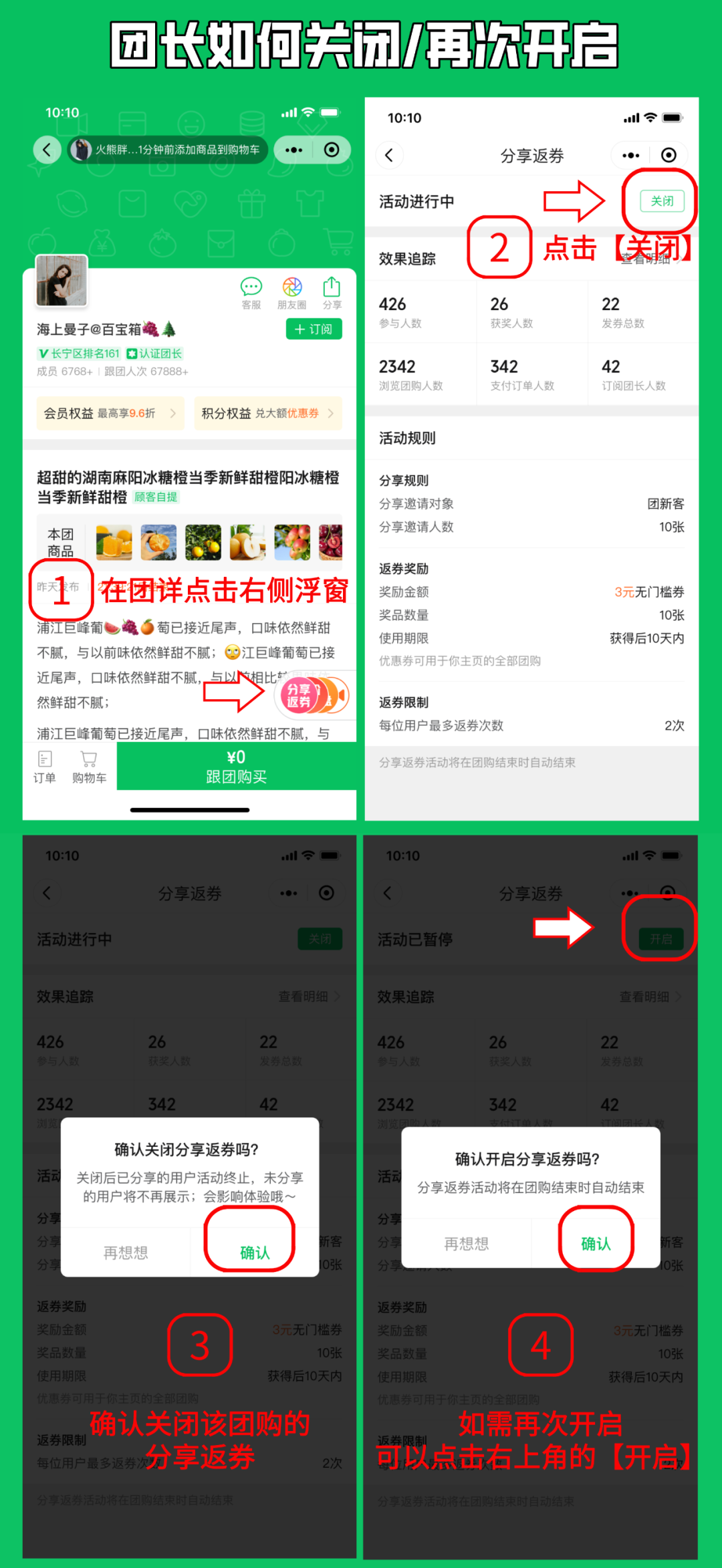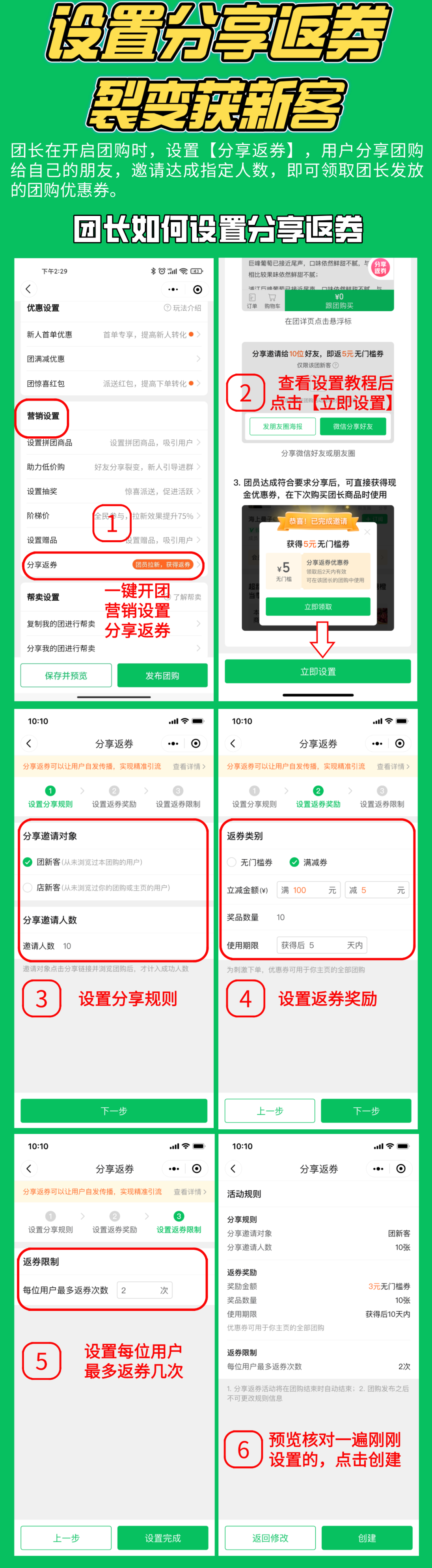 团长开团时设置【分享返券】,用户分享团购给朋友点击查看,"拉人头"到指定人数,就能领取团长发放的团购优惠券~