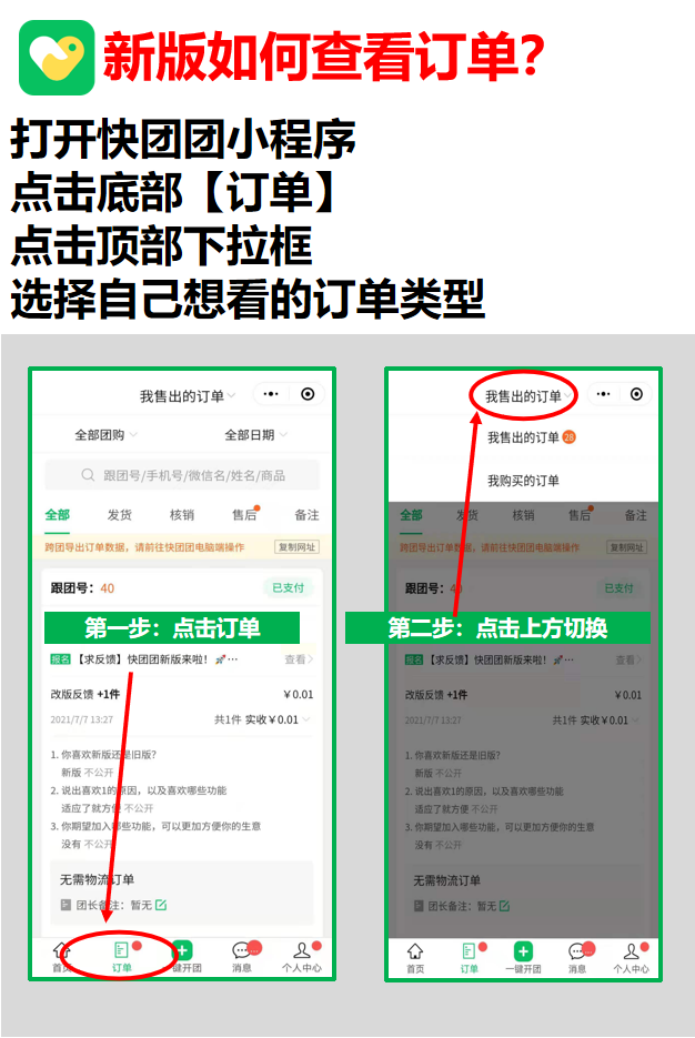 底部栏订单新增了 团长端的订单元素 ;