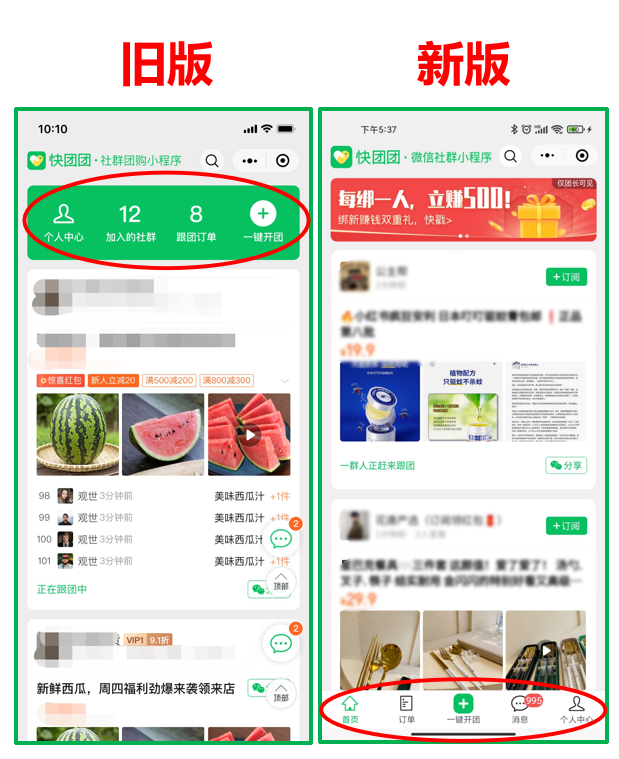 最明显是就是首页的【一键开团】从顶部迁移至底部。
