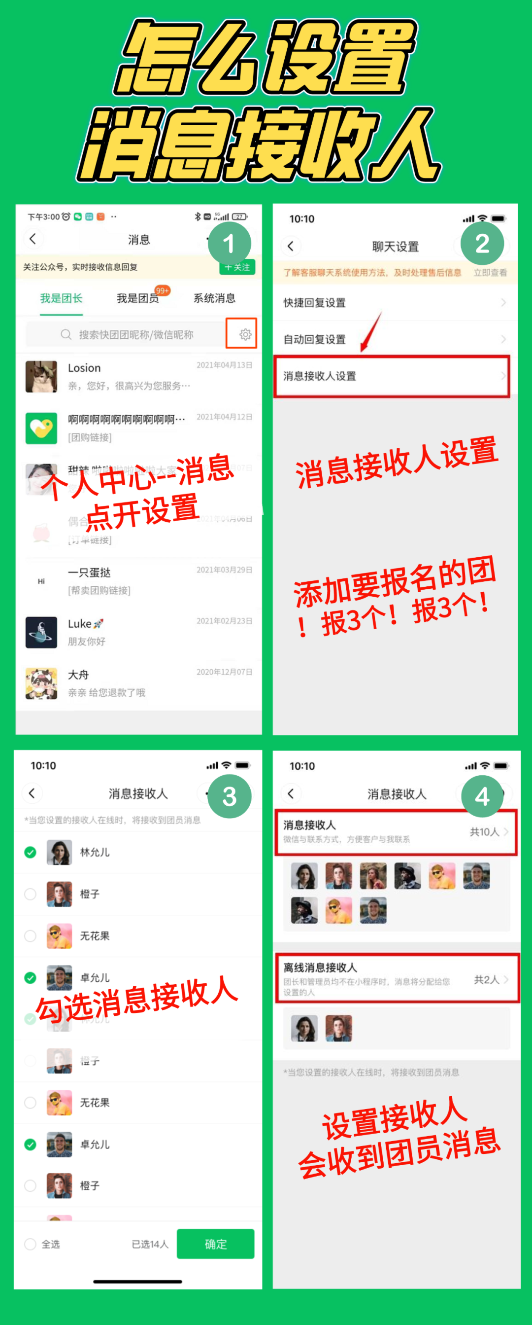3、团长可以设置几个离线消息接收人。当消息接收人 均不在线时,所有的消息会被统一推送至离线消息接收人处 。