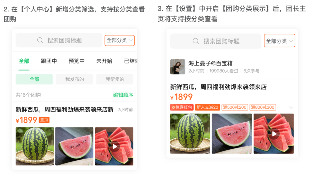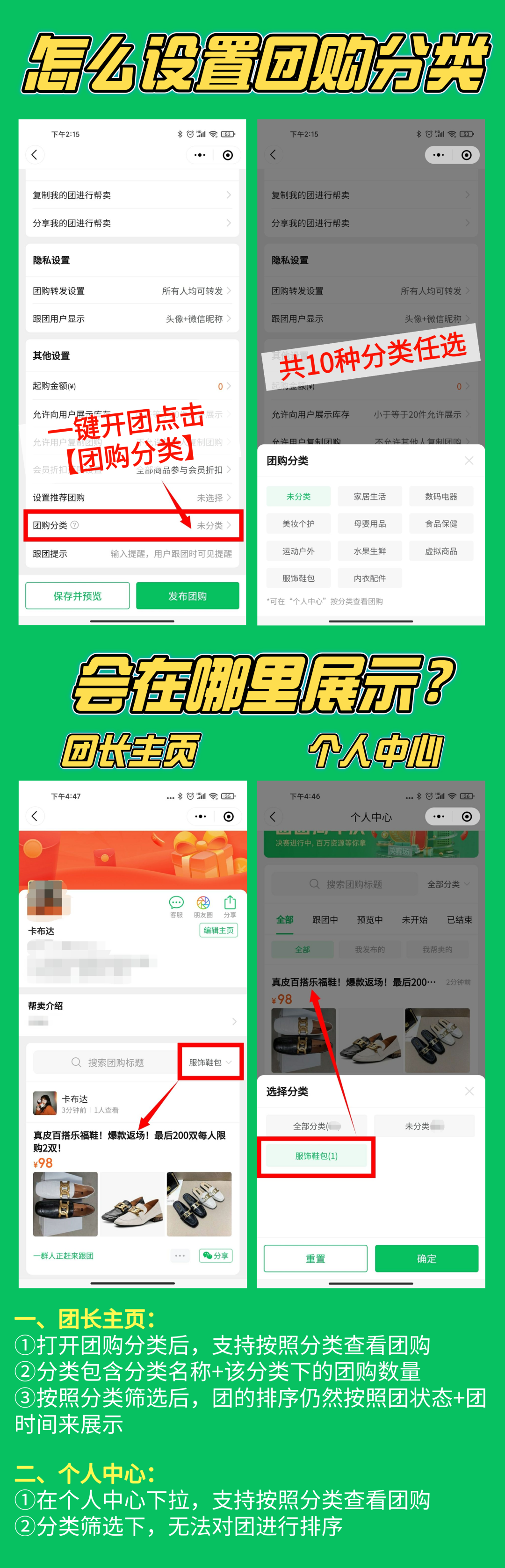 为了帮助团长主页高效展示团信息,促进下单购买,我们新出了 【团购分类管理】 功能。