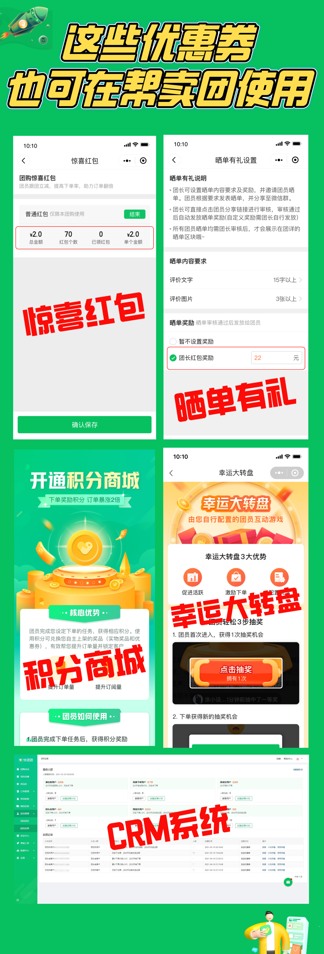 这些优惠券(惊喜红包、晒单、积分商城、幸运大转盘、CRM团员管理系统等),可在帮卖团中使用!
