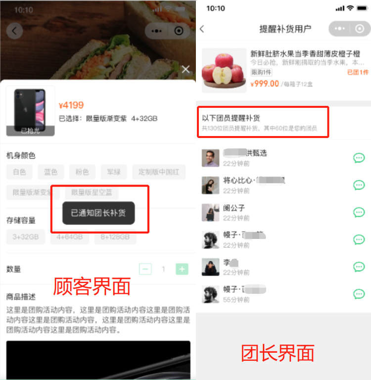在团结束、商品售罄的时候,顾客的团详页面会出现 【提醒团长补货】 的按钮,顾客可以点击提醒。