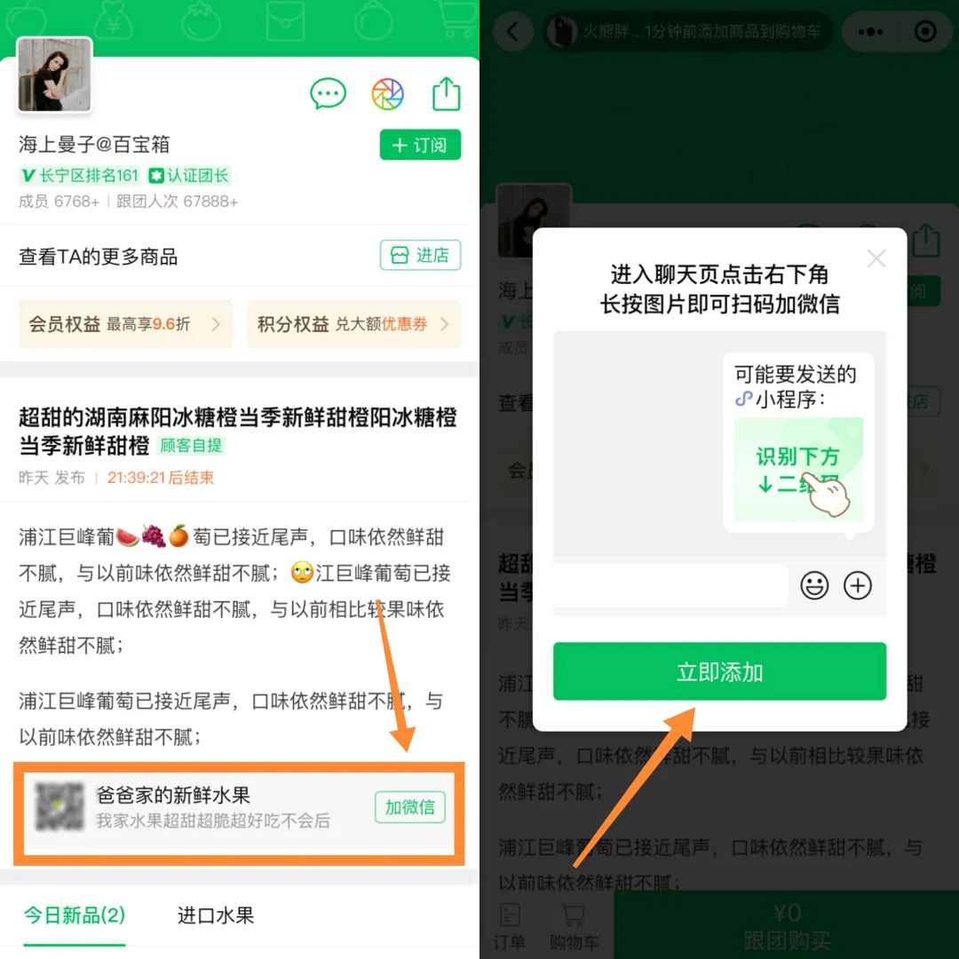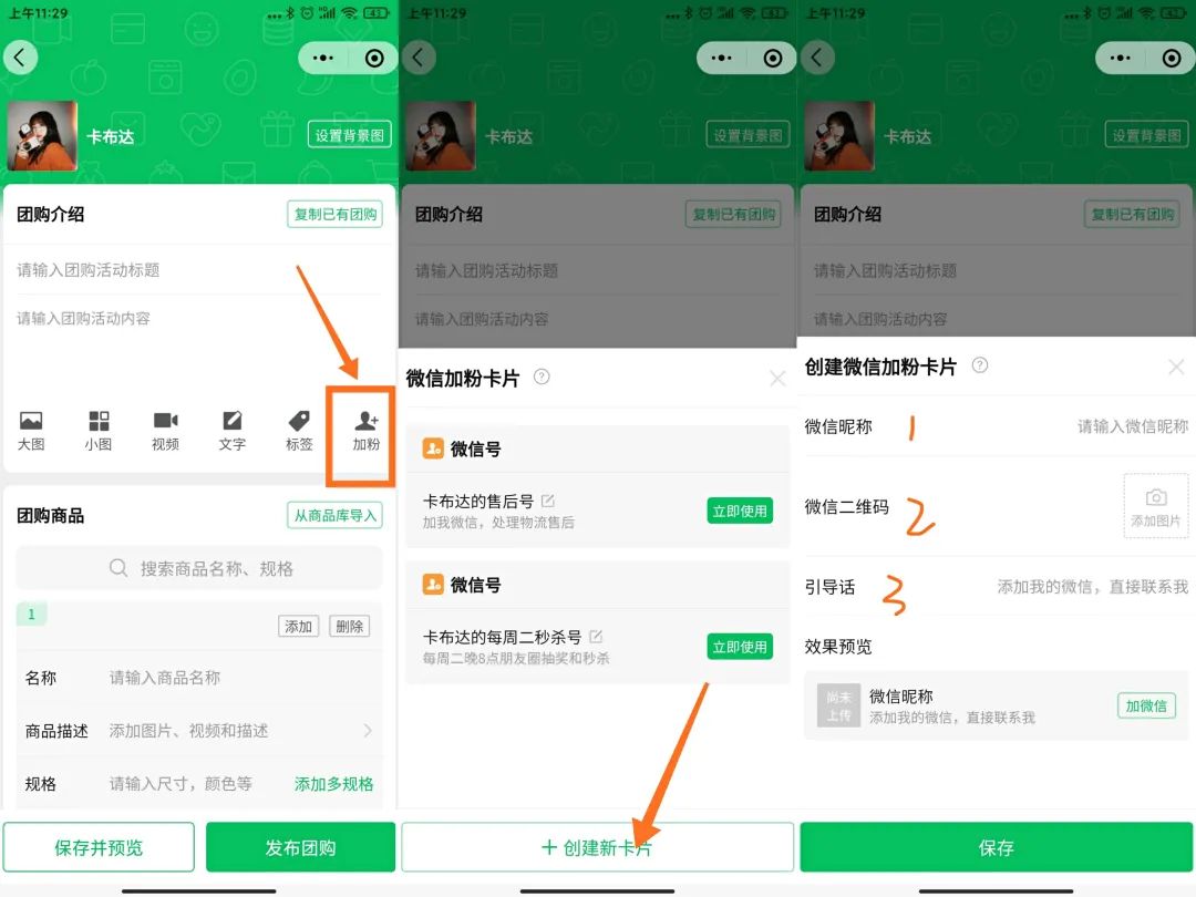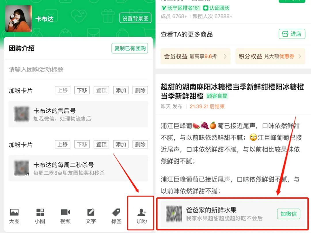 一些团员被朋友推荐购买了商品,但并不在团长的社群或微信通讯录中,可以通过【加粉卡片】引导他们加微信, 牢牢锁定新用户不流失 。\