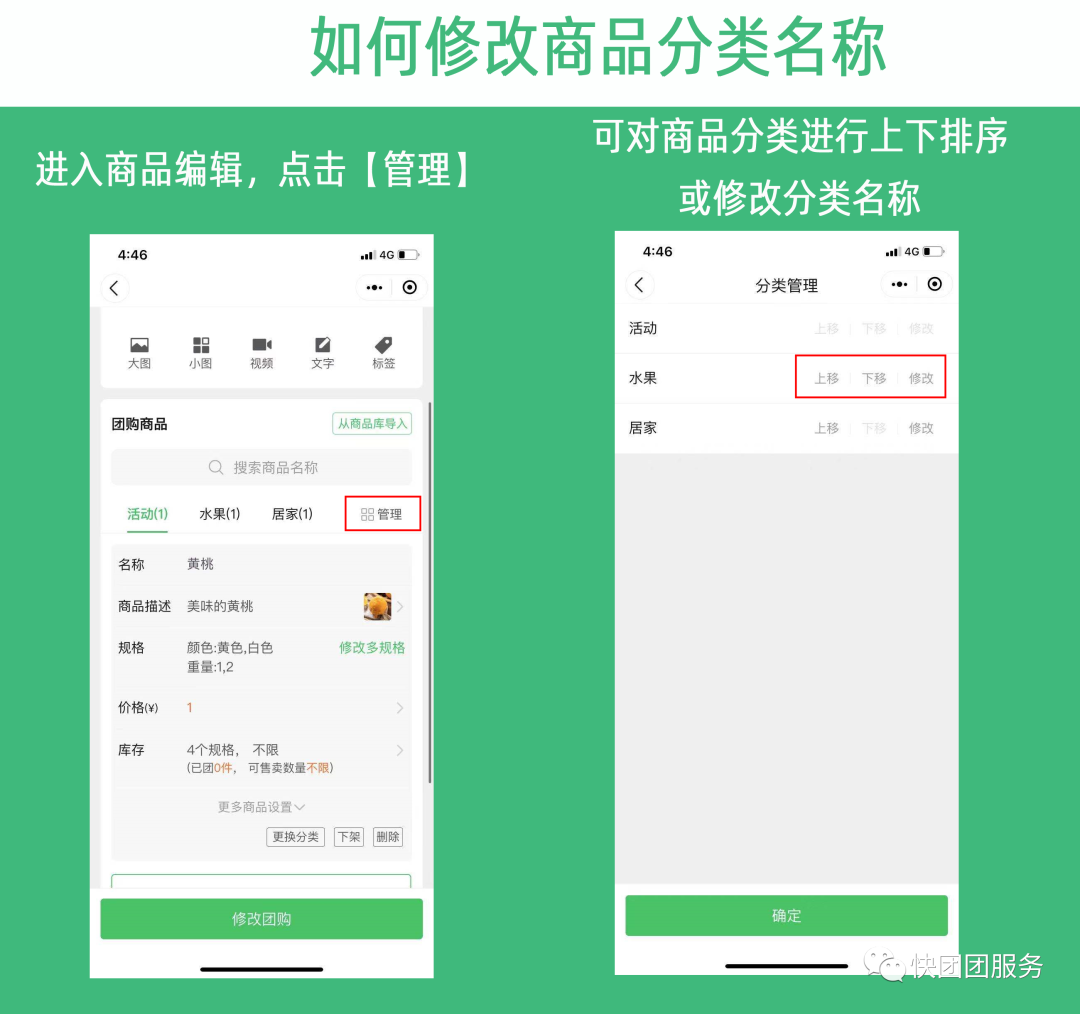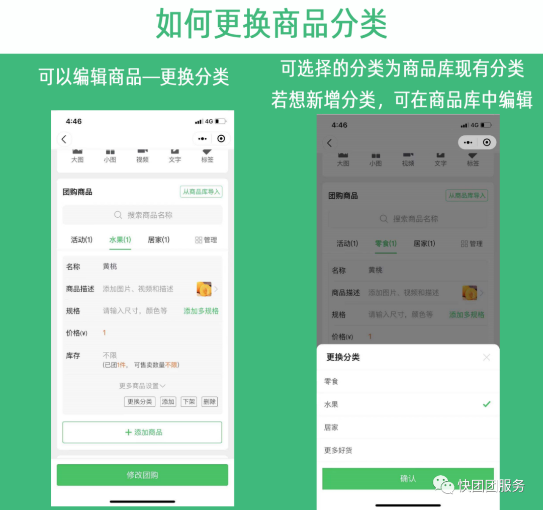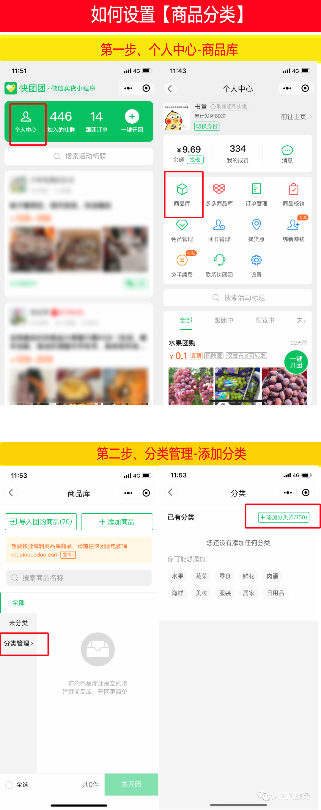 将团购商品进行分类,顾客可以按照商品分类选择产品,团长需要进行【创建商品分类名称】和【给商品设置类别】两步操作。