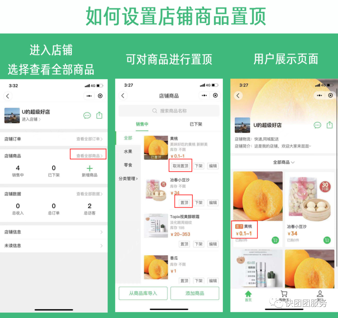 团长进入店铺,选择查看全部商品, 可以对店铺内商品进行置顶等操作 。
