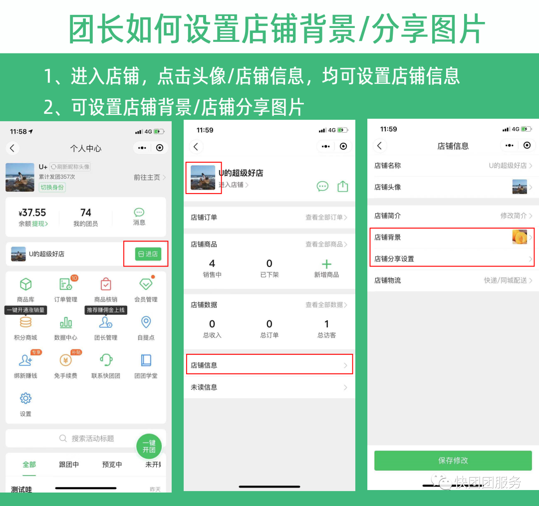 进入店铺页面,点击团长头像/店铺信息,可以进入店铺信息修改页面