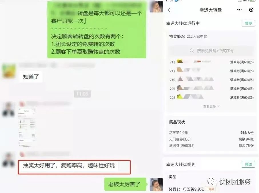 群内气氛活跃,用户反馈极佳,96%的用户都参与了抽奖活动,并有68%的人在2天内进行了跟团消费。