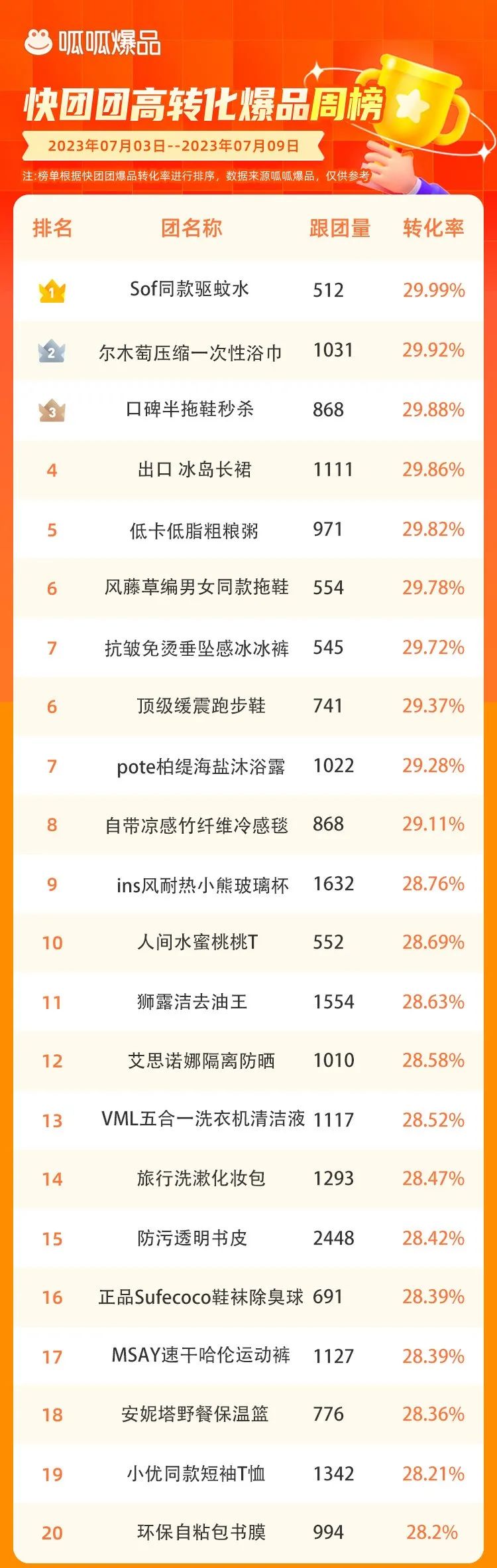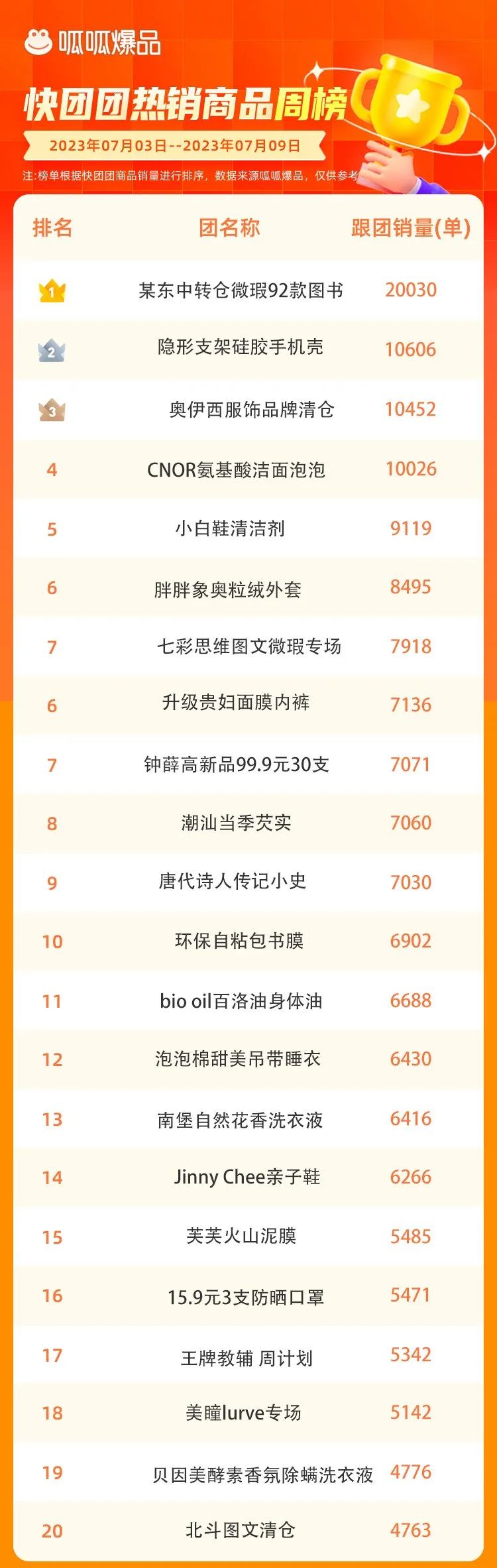 注:榜单统计时间为7月3日至7月9日,源自呱呱爆品对公开数据的统计与整理,不代表快团团官方观点,仅供参考。