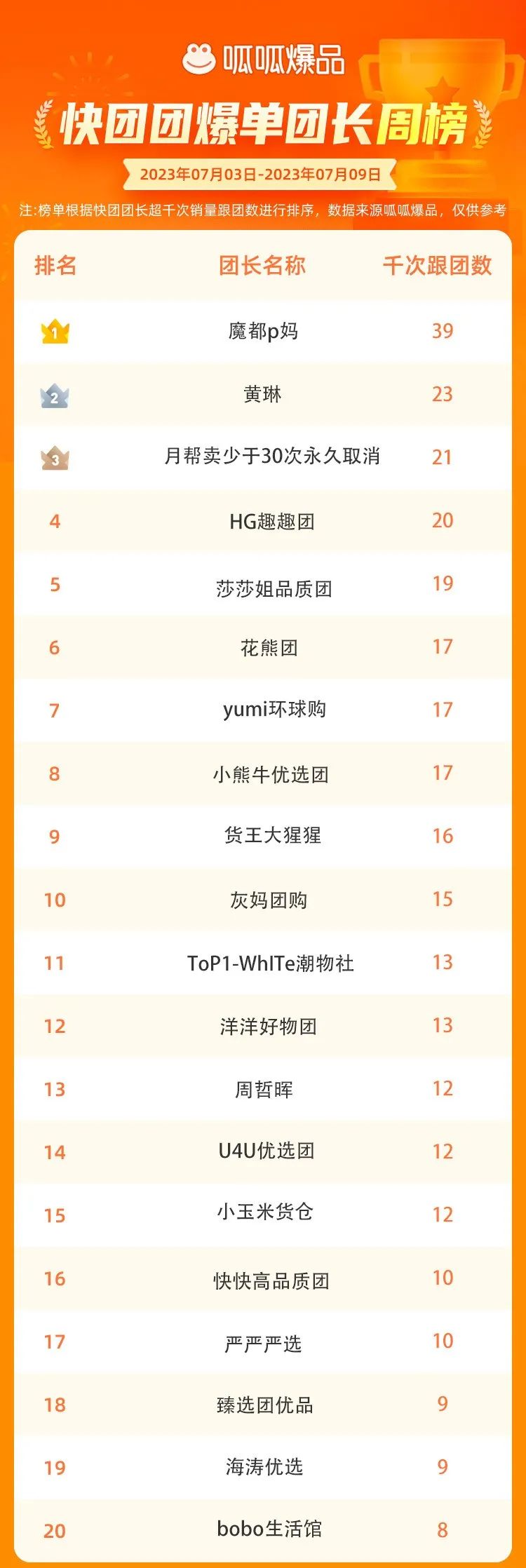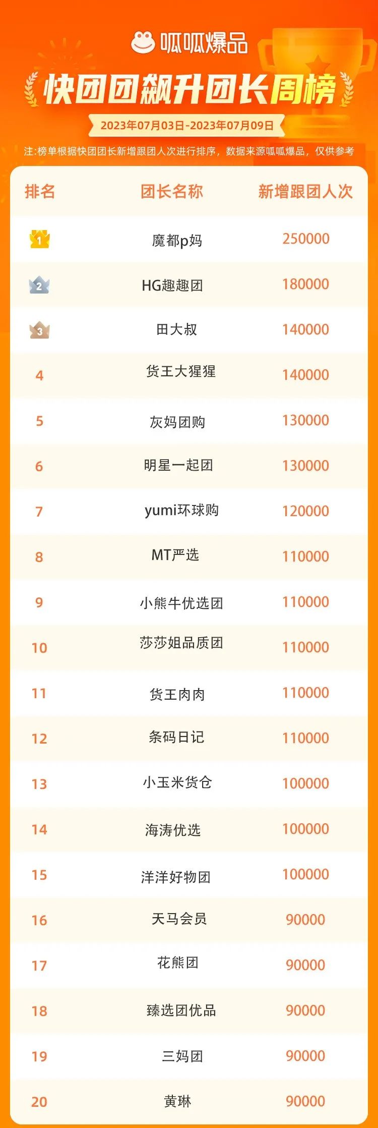 07/13 呱呱爆品独家发布快团团数据周榜:黑马团长田大叔新增跟团14万次,夏季清仓爆品数据亮眼!