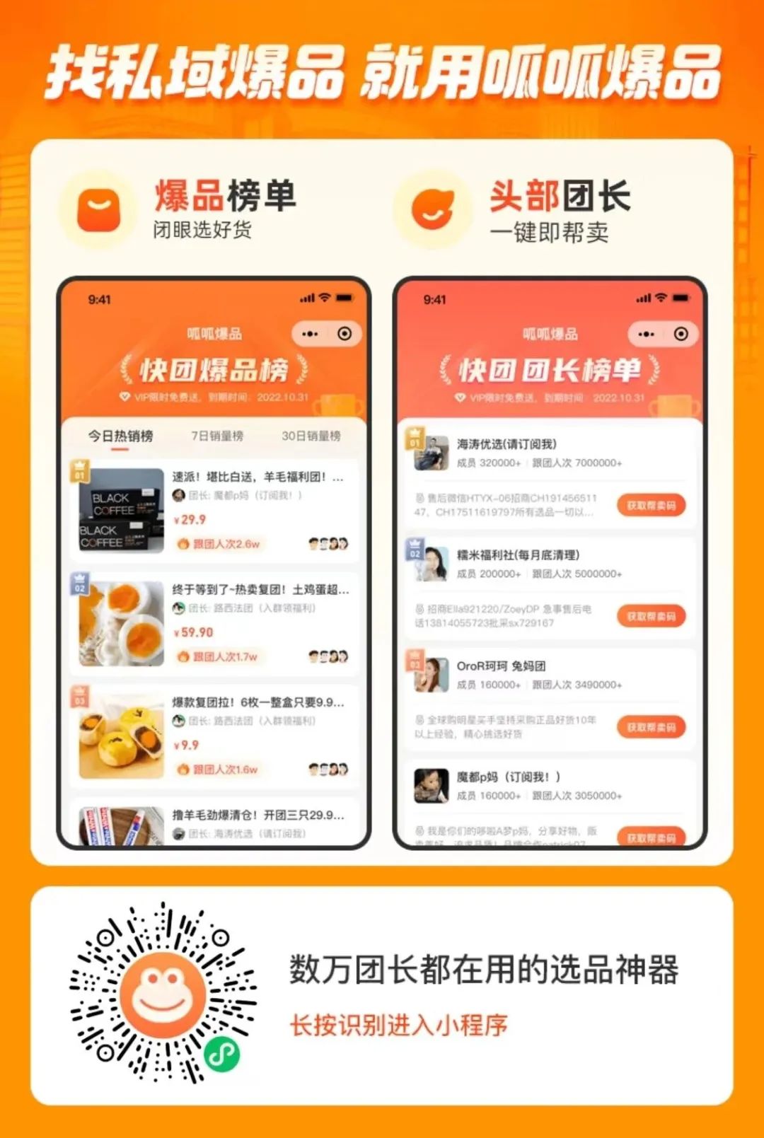 呱呱爆品是首款快团选品数据工具与爆品孵化平台,集数据服务、资源对接为一体 的快团数据选品工具,截至目前已经累计服务超过8万名团长,支持提供【快团团爆品榜单】、【快团团长资源库】、【爆品数据分析】、【资源对接合作】等服务,快团找团长,找爆品,找合作,就用呱呱爆品!