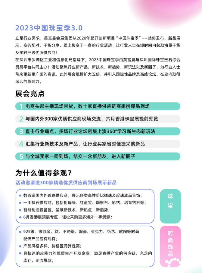 立足行业需求,英富曼会展集团从2020年起开创新项目"中国珠宝季"------趋势发布、新品展示、商务配对、干货分享、线上裂变于一身的行业活动,让行业人士在短时间内获取海量干货及接触严选优质供应商!