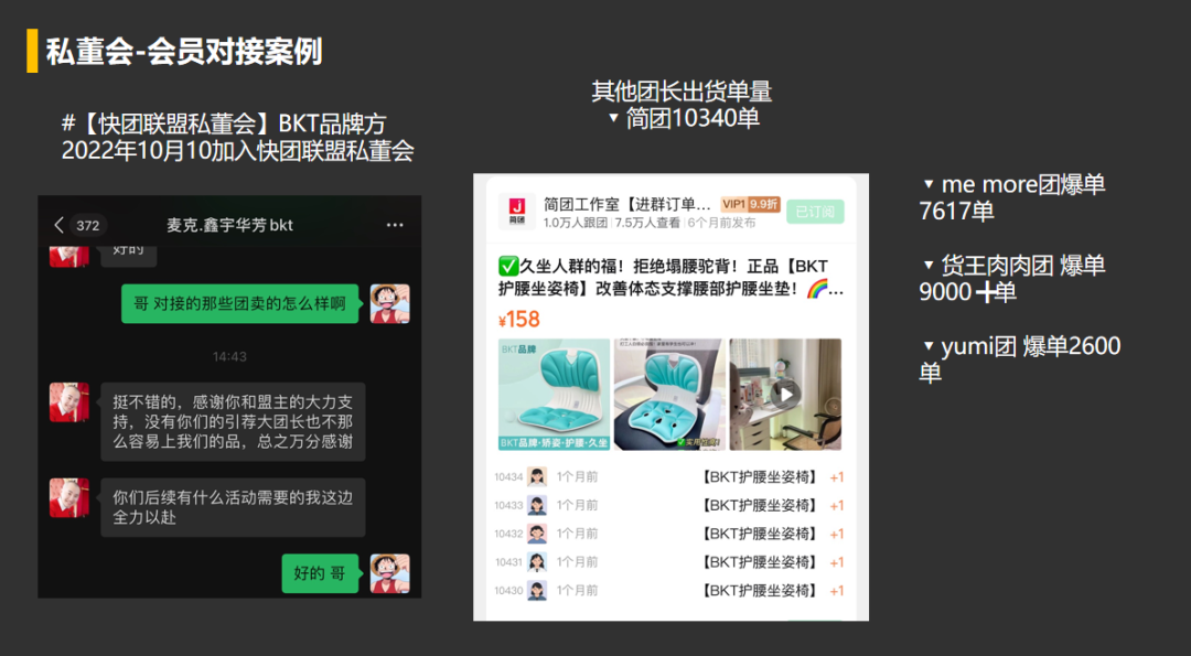 兵哥分享之后,快团联盟私董会项目负责人唬唬,介绍了目前快团联盟的服务内容,私董会权益,以及后续的活动规划,以及分享了部分私董会会员的案例。\
