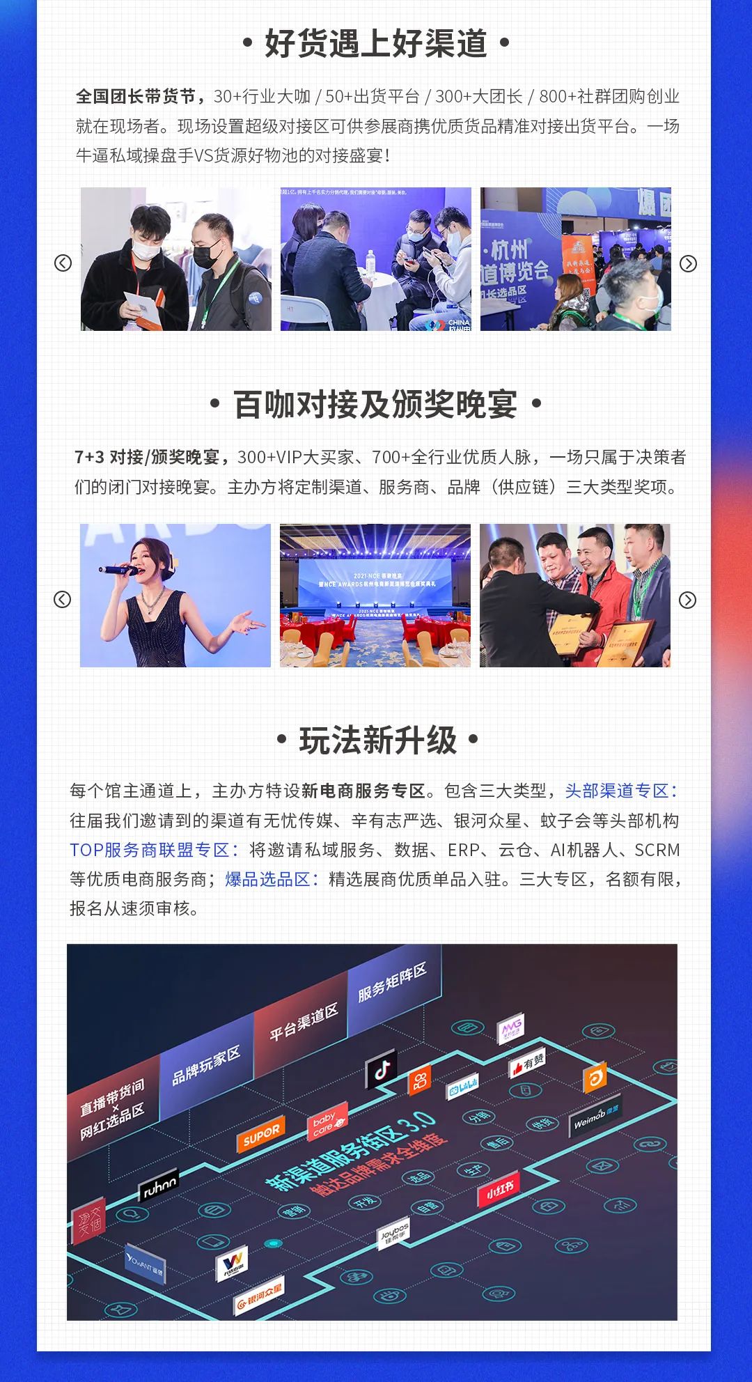 杭州电商新渠道博览会是渠道为核心的新型展会。展会会邀请抖音、快手、平台电商、直播、团购等各种当下各种带货渠道,一起参加。\