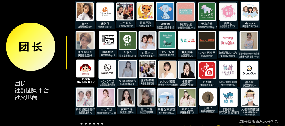 团长展位申请条件 : 快团团前150,群接龙前30,微店前10,其他社群团购平台。我们根据报名先后以及团长实力综合选择,最终会确定团长名单。