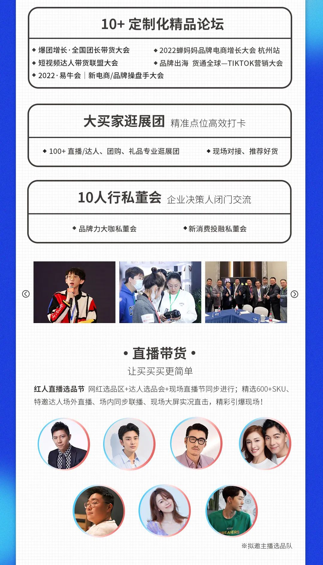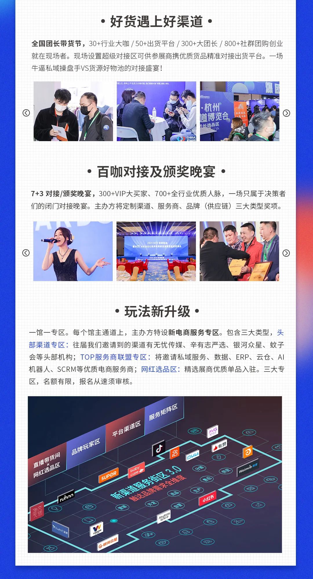 去年,我们联合杭州电商新渠道博览会,主办的"全国团长带货节",组织了团长对接会,取得了非常好的反馈,今年我们继续组织团长大会,在去年的基础上优化内容,提升活动水平,力求给到参展商、供应商、团长渠道嘉宾更多的收获。\