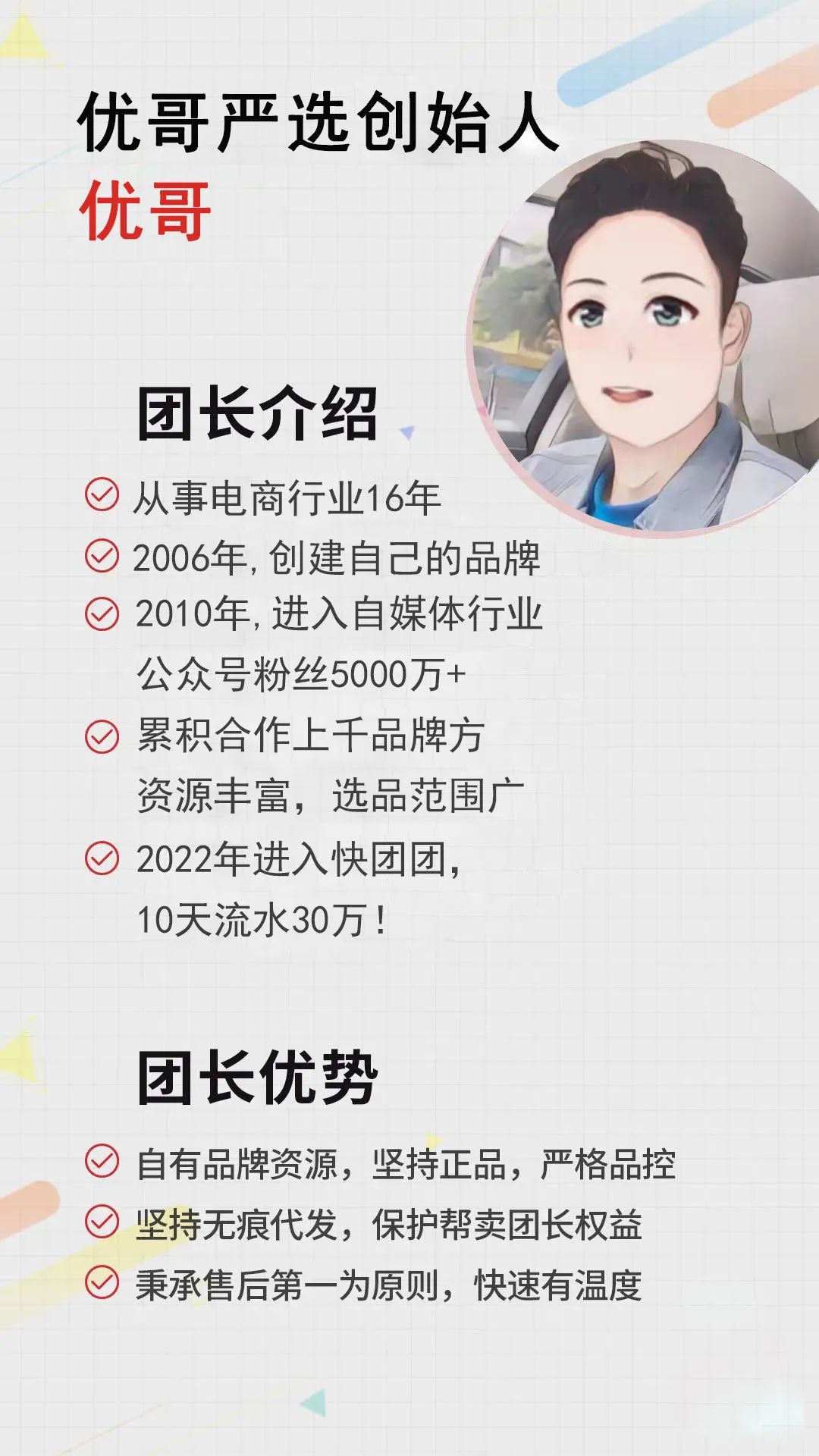 我是优哥严选的团长优哥,湖南长沙人, 06年开始做电商,有着16年的电商经验。在有赞稳居Top2,公众号粉丝5000万➕ ,现在也是首批从公众号转型快团团的探路人,10天流水30w, 第二个月流水突破300w!\