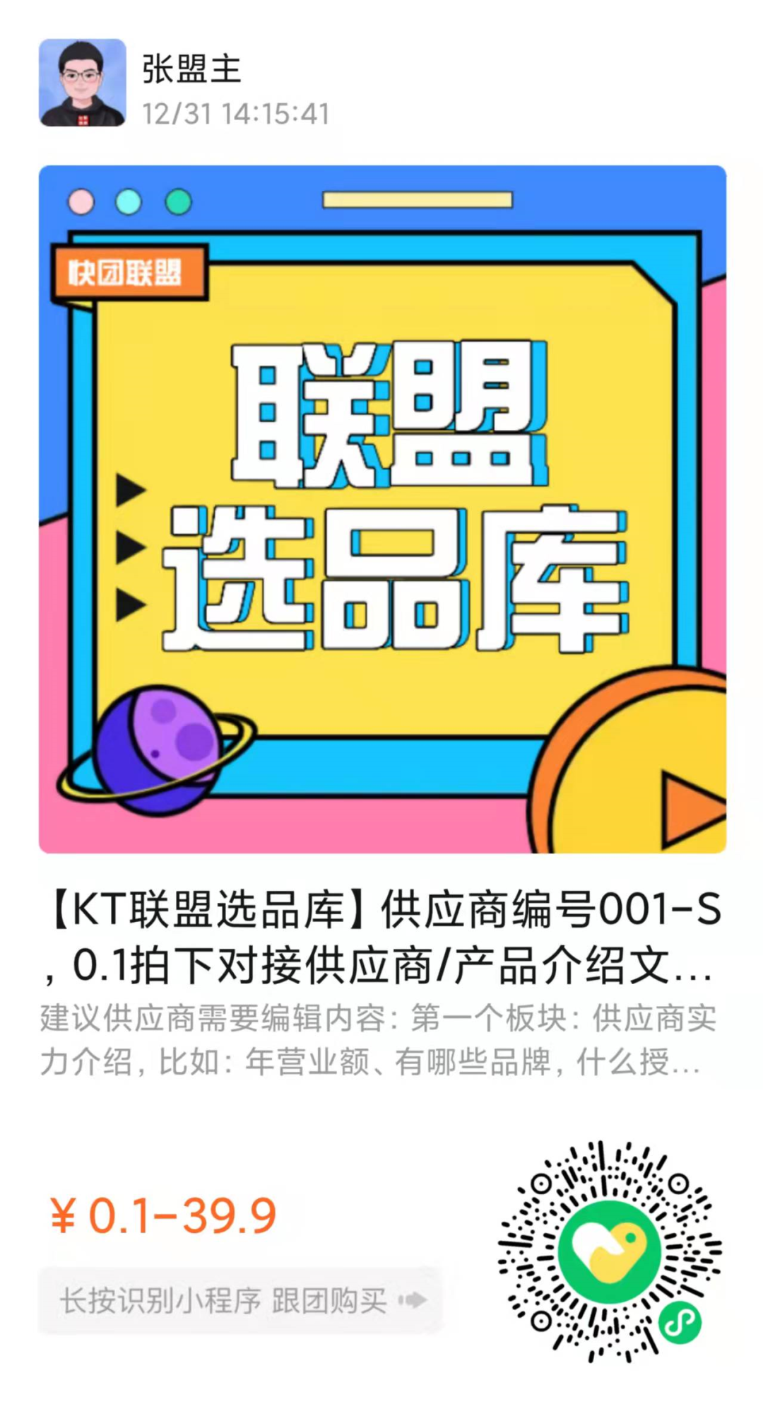 基于这个背景,我们快团联盟搭建一个选品库,供应商可以按照我们的这个模板创建一个快团团链接,然后我们复制过来,发布展示,推送给团长选品。