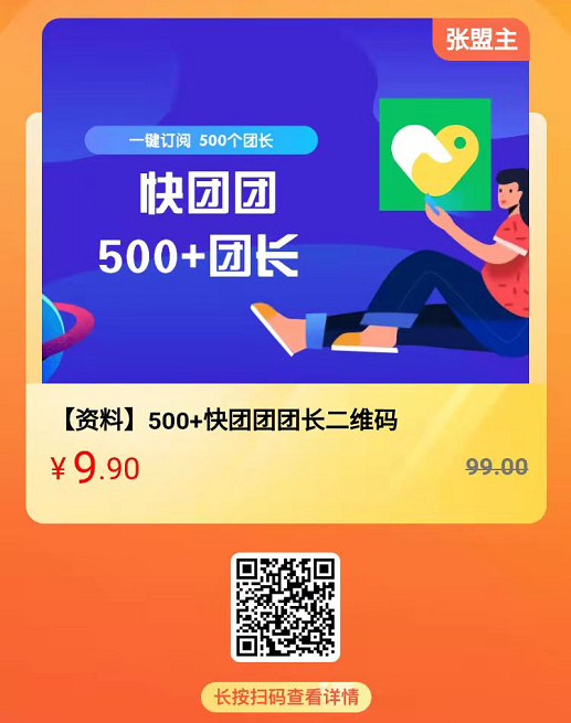 2021/12/20 【资料】500+团长二维码2021/12/20 【资料】500+团长二维码原文链接1)下面是快团团团长大团长申请帮卖二维码, 每个二维码都是20个团长2)头部团长很多会设置帮卖门槛,如果你自己的团员数和跟团次数太少, 建议先自己去增加数据,提升自己的竞争力 ,不然通过率比较低。即使你通过成为大团长的帮卖,如果你在后续没有持续订单,也会被取消帮卖资格。3)如果你不知道怎么样提升自己的团员数和跟团次数,不知道怎么引流做社群,你可以直接购买 《快团团,从入门到精通》 系列视频课程,全面学习。
