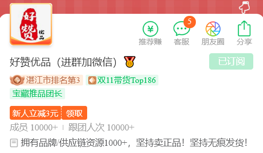 🌟2011年在天猫开店,创立了自有品牌,🌟2015年接触自媒体,微博与公众号峰值到达1000万的粉丝,因此我们拥有一批忠实的粉丝~🌟2017年成立两家有赞店铺,同年创立并注册自有商标品牌【好赞优品】,🌟今年7月进入了快团团,目前的帮卖团长超过5000个,直客数量超1万+。