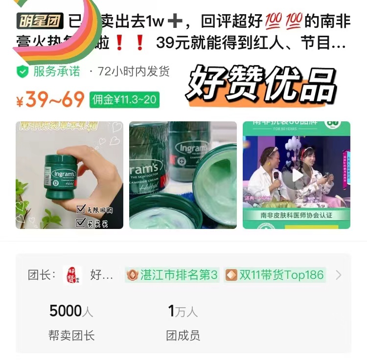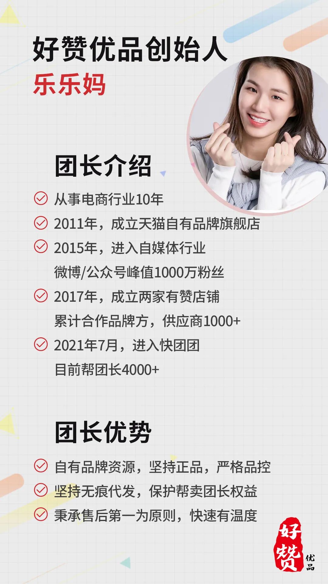 这十年间,从天猫到自媒体,到有赞,到现在的快团团,我们也是掌握了很多优质资源:\ ❤第一,合作了上千家的品牌方和供应链资源,在选品上,大家放心一键帮卖,我们有强大的资源支持。\ ❤第二,自有发货仓库,无痕代发!保护团长隐私,坚持不偷客!不伤客!\ ❤第三,有一个完善的体系,选品--运营--文案--美工--售前--售后,每一个岗位都有专门的人员对接。
