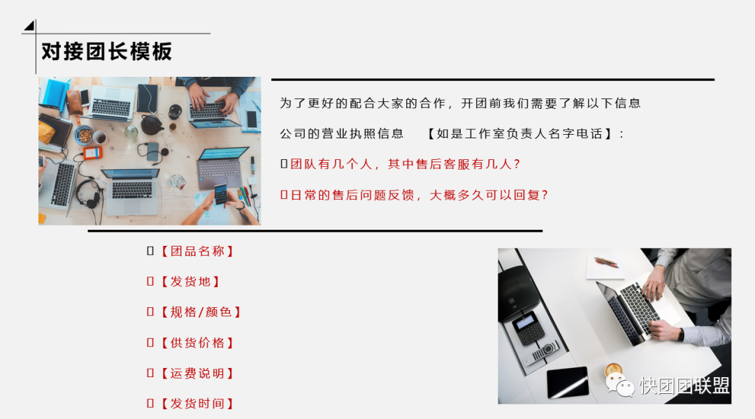 日常工作中,团长的时间非常忙碌,看款,定款,拿样,实拍,上架,运营,客服,售后等一系列问题,那就需要一个思路非常清楚,供货能力好,售后服务专业,清晰的供应商对接。那么团长只管往前冲,你们做好后勤保障!