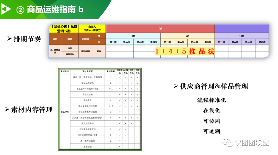 比如,关于如何做团的排期节奏,华哥分享了他们的一套方案(1+4+5推品法),给大家参考。