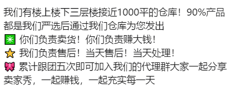 后来有了采源宝,我们一直就开始成为小伙伴们的仓库,为大家无痕一件代发,主要做微爆款,我们始终坚持,售后第一,无论何时,绝对不会,卖货有人,售后无人!所有产品我们都会严选把关,绝不会或没看见,直接卖图片!