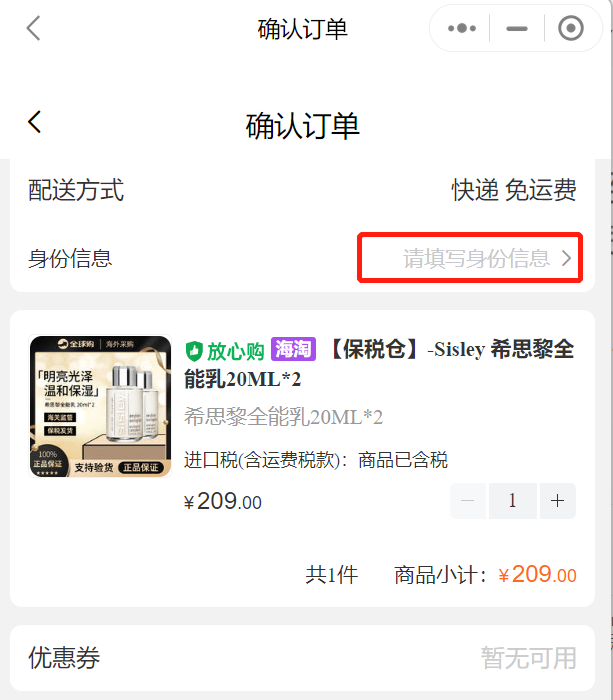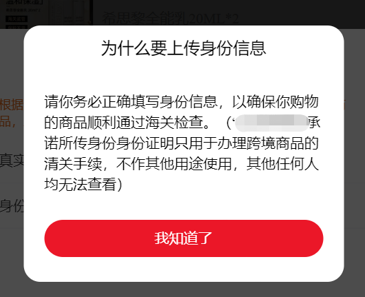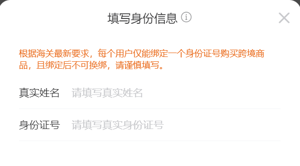 身份信息是姓名和身份证号码。根据海关想要求,一个用户只能绑定一个身份证号购买跨境商品,并且绑定之后不能更换。\