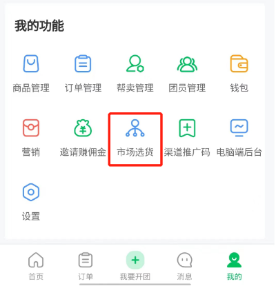扫码注册之后,看不到市场选货。这个是需要向官方申请,开通白名单之后,才能看到。因为这个需要确认是团长才能看到,不能给顾客看到。