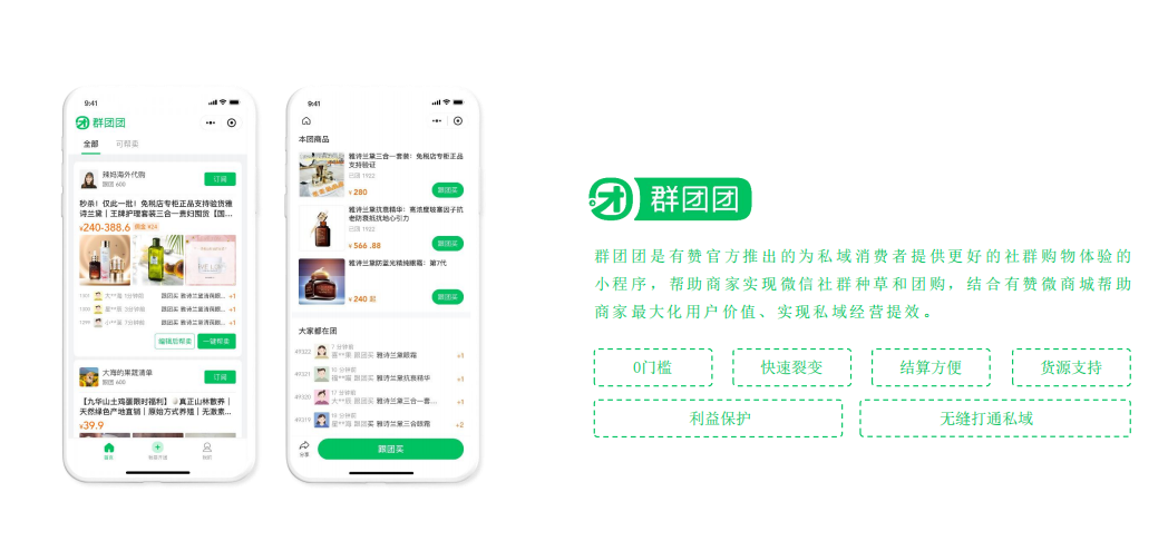 有赞自己本来就有一个非常完善的分享市场,里面有各种品牌的产品,之前都是沉淀在微商城体系内。分销市场的产品和群团团,在后台是可以打通的。
