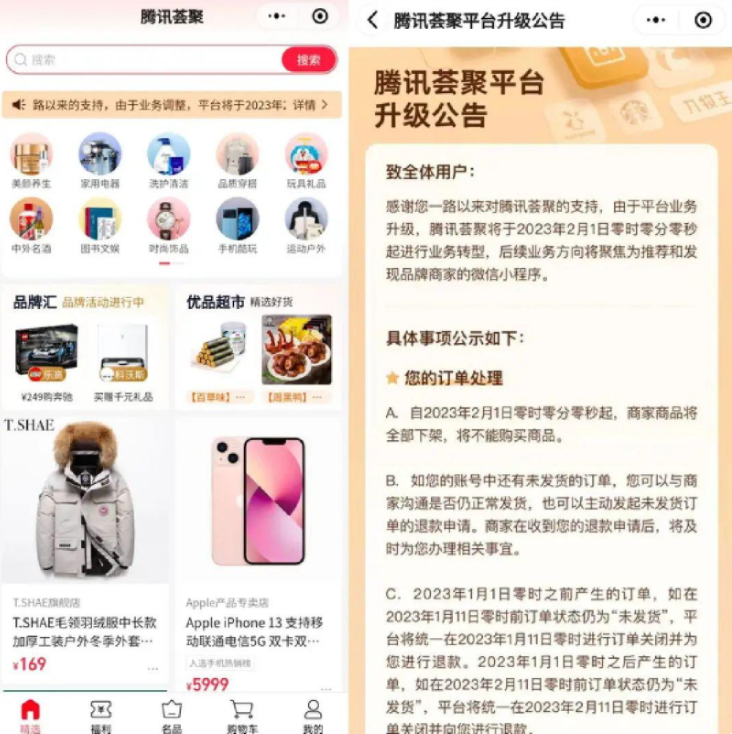 还有腾讯惠聚。腾讯旗下电商小程序腾讯荟聚将在2月1日转型为全新的平台,根据升级公告显示,腾讯荟聚转型后,后续业务会聚焦推荐和发现品牌商家的微信小程序,类似于品牌商家的聚合入口。