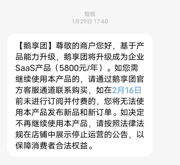 短信的内容,是说鹅享团将进行产品能力升级,之前免费使用的工具,将变成收费的SAAS服务。 这也就意味着,原来和快团团一样的免费工具路线,貌似是走不通了。