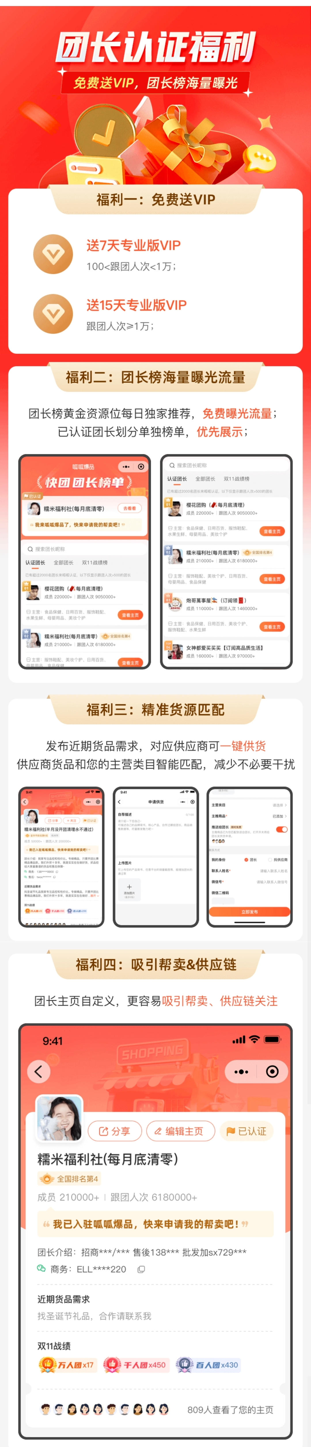 认证后的团长可自主编辑主页需求,通过平台核心流量位的曝光,能够吸引大量帮卖团长关注,同时也便于优质供货商的合作申请;\