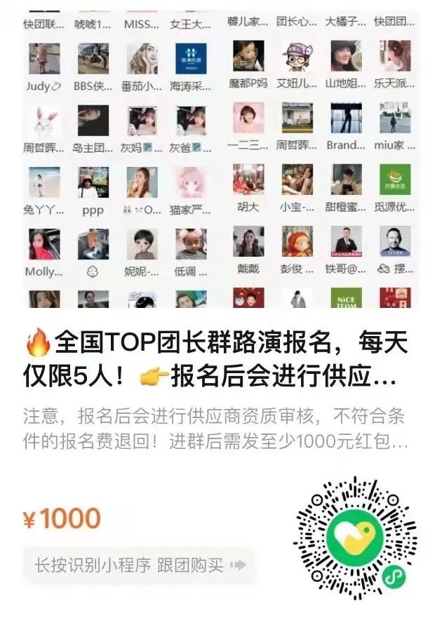每天最多安排5个供应商路演, 报名1000+进群红包1000, 相当于2000元的费用,对接200多个团长(报名费后续可能会调整)。供应商在群里停留24小时之后,会移出群聊。我们要保证群里的都是全国的TOP团长。在路演之后,我们会整理供应商信息,后续有团长要对接路演过的供应商,我们会帮拉群对接。