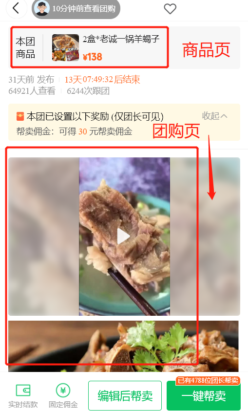 还有一点,帮卖团长更多只是在自己的社群分享链接,做到充分教育的也不多。 成交的关键,还是在团购页本身。 即使帮卖团长想在社群分享优质的内容,也只能从团购页里面提前,复制部分文案、图片、视频素材。